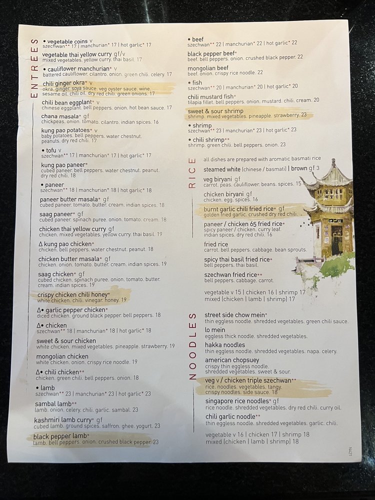 Very spicy. Choose Veg (vegan), or Chicken. Rice, noodles, vegetables, tangy, crispy noodles, side sauce.