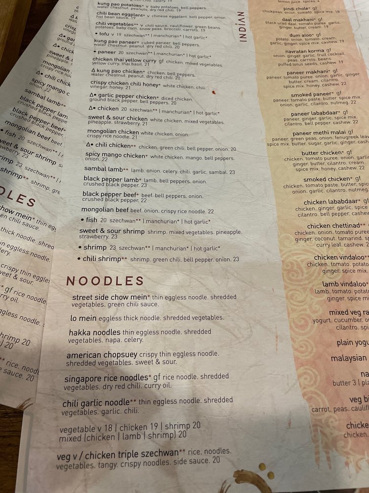Vegan. Spicy. Battered cauliflower, cilantro, onion, green chili, celery.Lunch Specials served with Veg Spring Roll and Soup of the Day. Includes choice of rice: steamed white/veg/chicken fried rice. Add veg/chicken hakka noodles (extra charge). Add naan/malaysian paratha (extra charge).